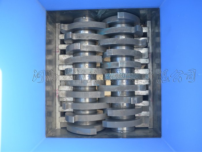 雙軸撕碎機采用兩套裝有撕碎機刀片的轉子在設備機腔內相對旋轉從而采用收縮兩軸夾角的原理對進入機腔內的物料進行擠壓,由于刀片的特殊設計進入兩軸夾角后的物料被刀片棱角固定從而進一步為夾角的收縮創造條件,在物料受力達到物料屈服強度后物料在刀片間開始斷裂,從而完成撕碎效果。
